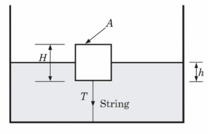 \[ \text{Buoyant Force} – \text{Weight} – T = 0 \] \[ \rho g h A – \rho_s g H A – T = 0 \] \[ T = \rho g h A – \rho_s g H A \] \[ \boxed{T = (\rho h – \rho_s H) g A} \]